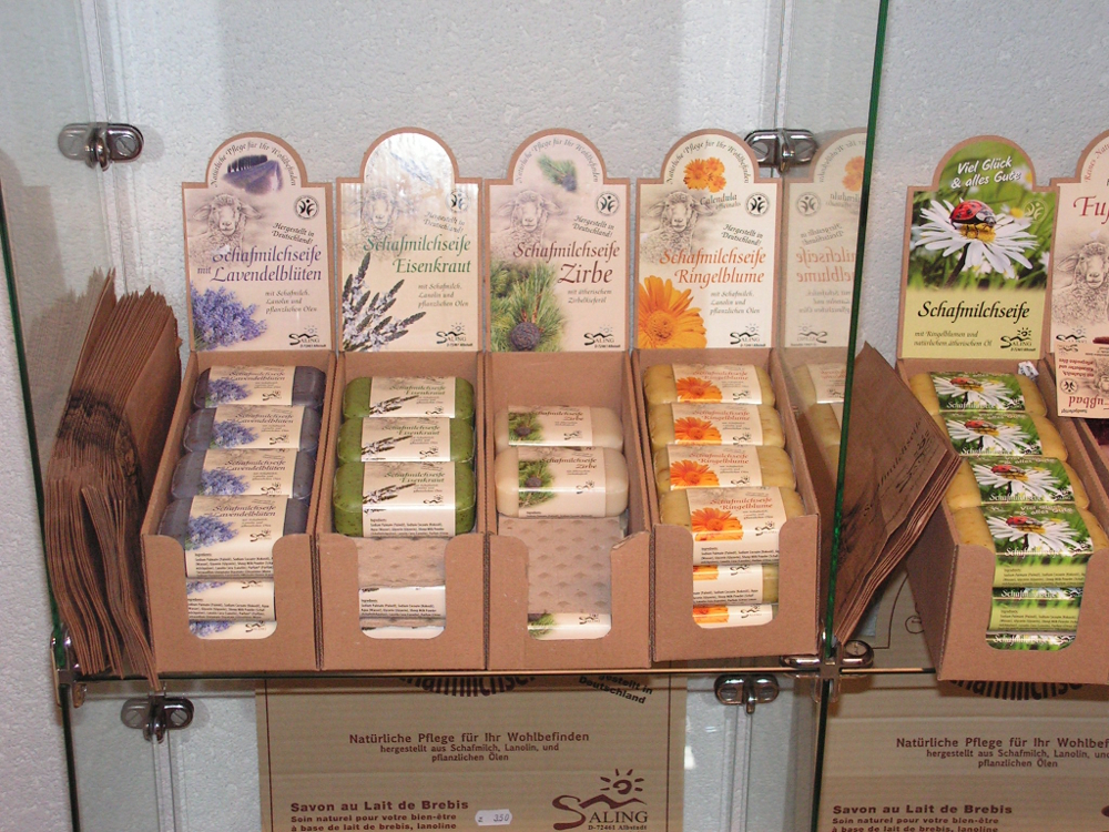 Im Hofladen sind auch Schafmilchseifen in verschiedenen Duftnoten, Lanolinprodukte für Körperpflege und Felle von eigenen Schafen oder aus der Umgebung.