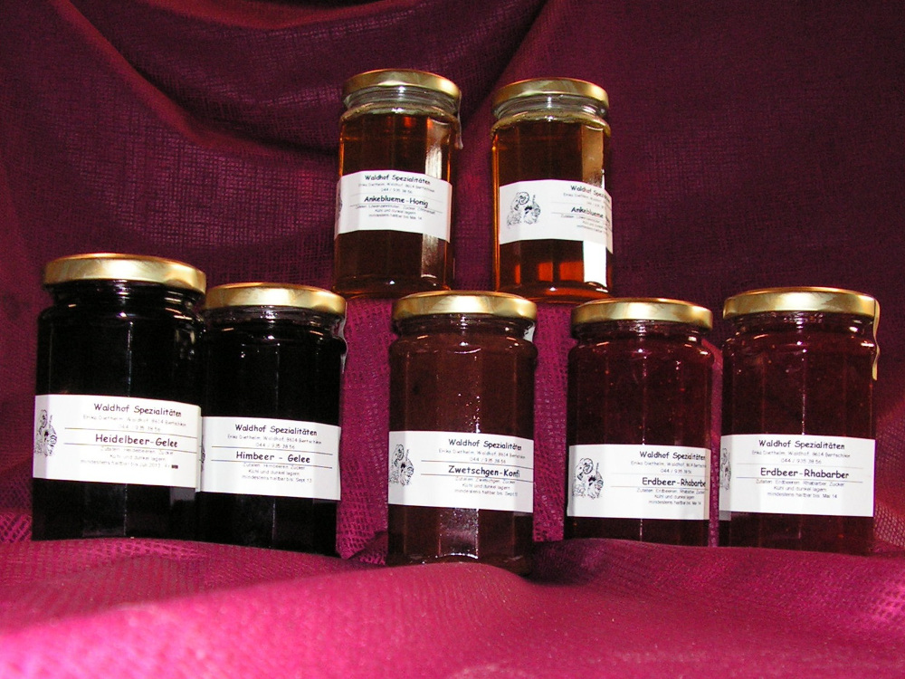 In unserem Hofladen finden Sie hausgemachte Konfitüre und Gelee mit Früchten aus dem eigenen Garten.